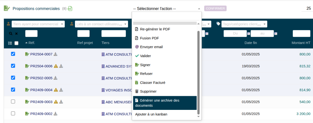 Depuis une liste telle que Propositions commerciales, vous pouvez sélectionner les documents désirés. Puis la liste d’actions « Sélectionner l’action » apparaît. Vous devez choisir l’action suivante « Générer une archive des documents » et confirmer votre choix.