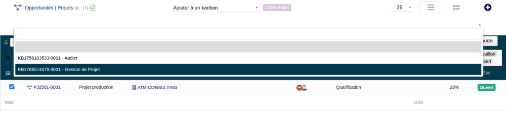 Vous pourrez également ajouter un projet, une tâche, une proposition …etc, à un kanban préalablement créé. Voici un exemple d’un projet ajouté à un Kanban « Gestion de projet ».